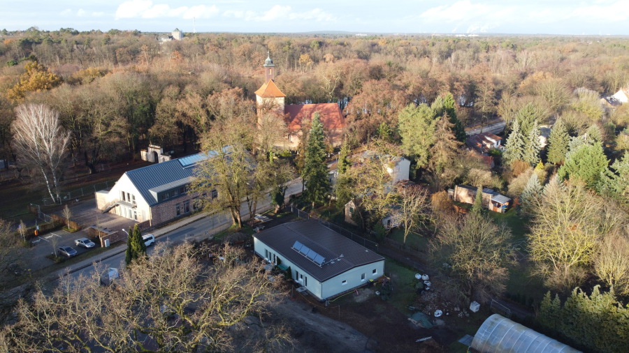Auf den Bildern ist unsere Gärtnerei zu sehen. 2014 noch mit dem Gewächshaus (mittig oben) und vor dem Neubau der Dorfkirche. Zwischen den Bäumen ist die Dorfkirche und die alte Dorfschule zu erkennen. Weiter oben sehr gut zu erkennen, der Machnower See nahe der Schleuse Kleinmachnow.