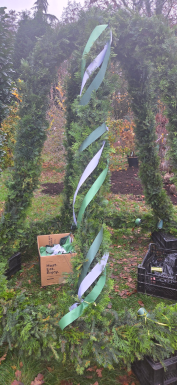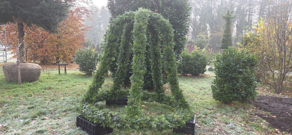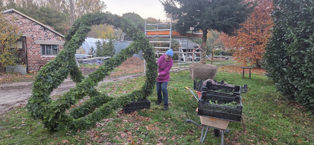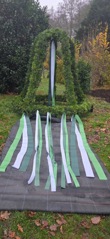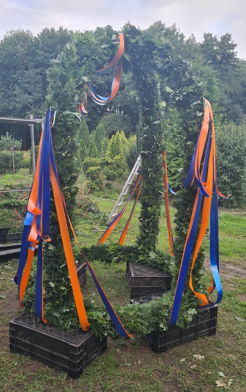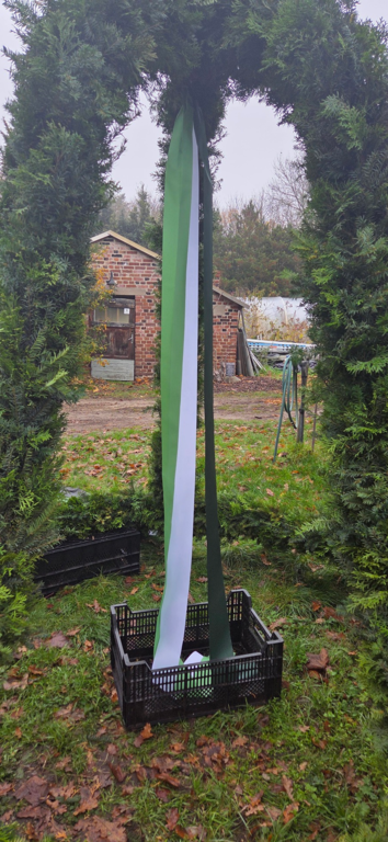 Andere Größen auf Anfrage als Sonderanfertigung oder Metallgestell bauseits. Unter Umständen wäre auch ein Metallgestell, Höhe ca. 230/230 cm und Breite ca. 250 cm über einen unserer Kunden (Dachdeckerfirma aus Berlin) als Leihgabe möglich. Bisher haben wir nur in seinem Auftrag dieses Gestell gebunden und mit Bändern versehen.