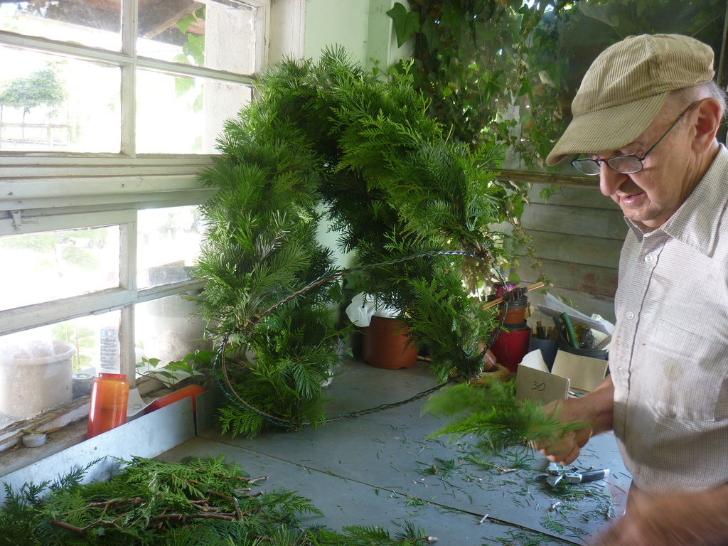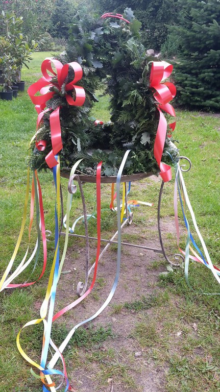Unsere Richtkronen und -kränze sind frisch und liebevoll von Hand gebunden aus verschiedenen Materialien, wie Koniferen- und Tannengrün, Immergrünen Laubgehölzen und im Sommer gelegentlich Eichenlaub kombiniert mit Koniferengrün. Soweit keine Sonderwünsche geäußert werden, stammt das komplette Bindegrün aus unserer eigenen Produktion.